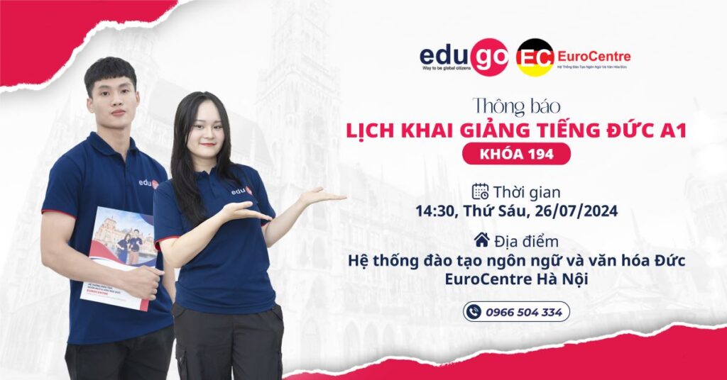 Lịch khai giảng chi tiết lớp tiếng Đức trình độ A1 K190 ngày 12/07/2024 tại EuroCentre Hà Nội: